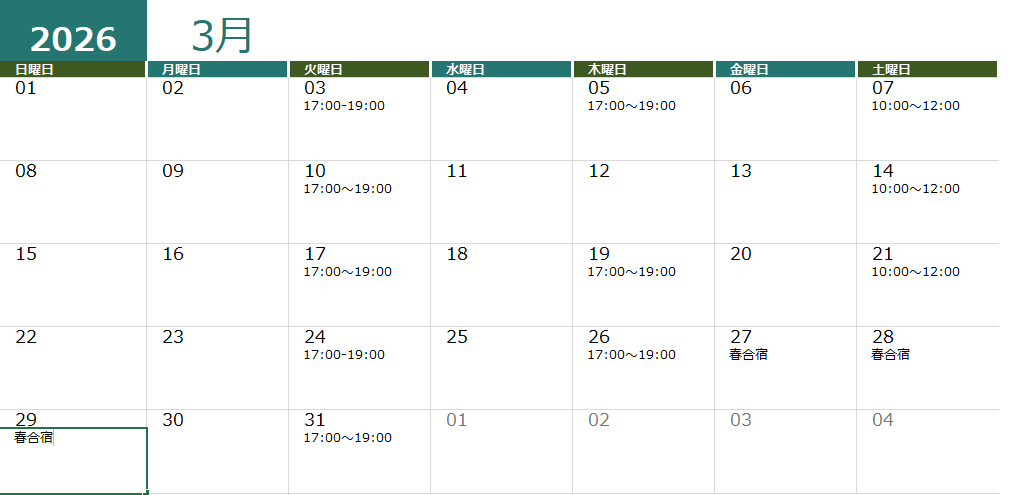 稽古は週3回、火17:00~19:00、木17:00~19:00 土10:00~12:00です。